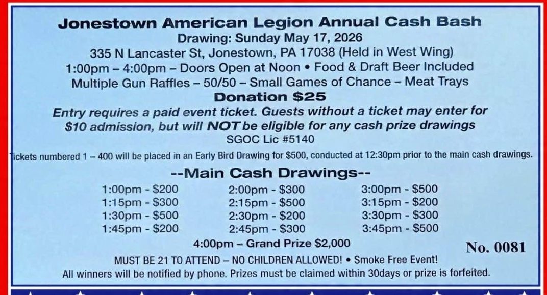 Join us in the West Wing of the Jonestown American Legion for our Annual Cash Bash! Cash drawings every 15 minutes for those who purchased tickets in advance, with an early bird drawing at 12:30 for tickets 001-400. Free food and draft beer included at the event. Guests may purchase tickets for entry the day of the event for $10 and can participate in all events but will not be eligible for any of the cash drawings. Small games of chance, 50/50's, meat trays and gun raffle will take place during event.